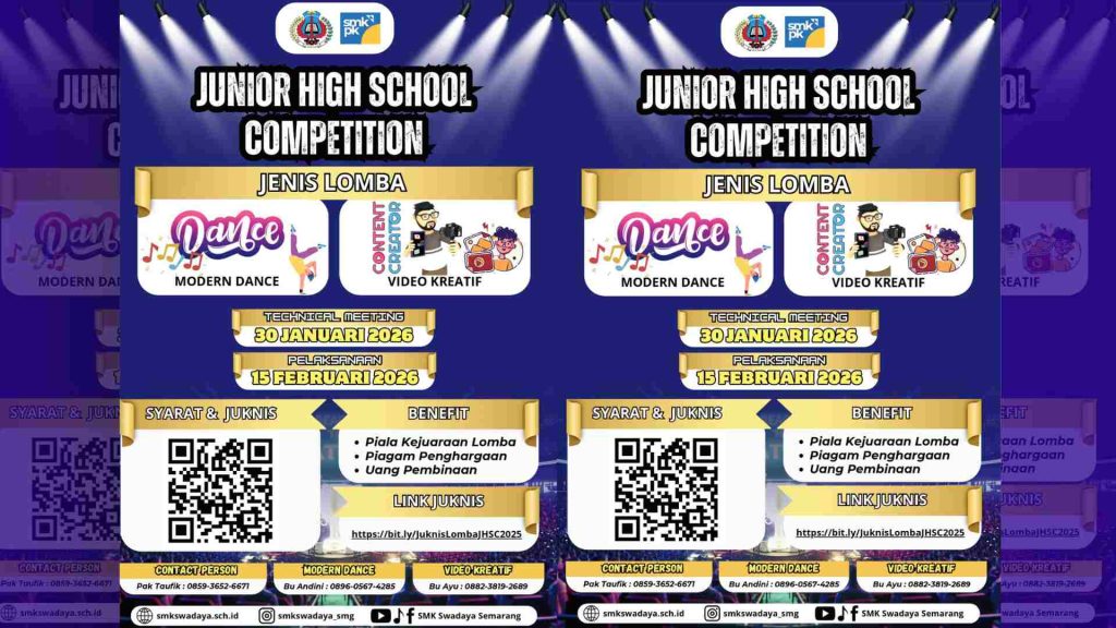 SMK Swadaya Semarang kembali menunjukkan komitmennya dalam mendukung pengembangan bakat dan kreativitas generasi muda melalui kegiatan Junior High School Competition (JHSC) 2026. Kegiatan ini ditujukan khusus bagi pelajar SMP/MTs sederajat, sebagai wadah untuk menyalurkan potensi di bidang seni dan konten kreatif secara positif dan kompetitif.
